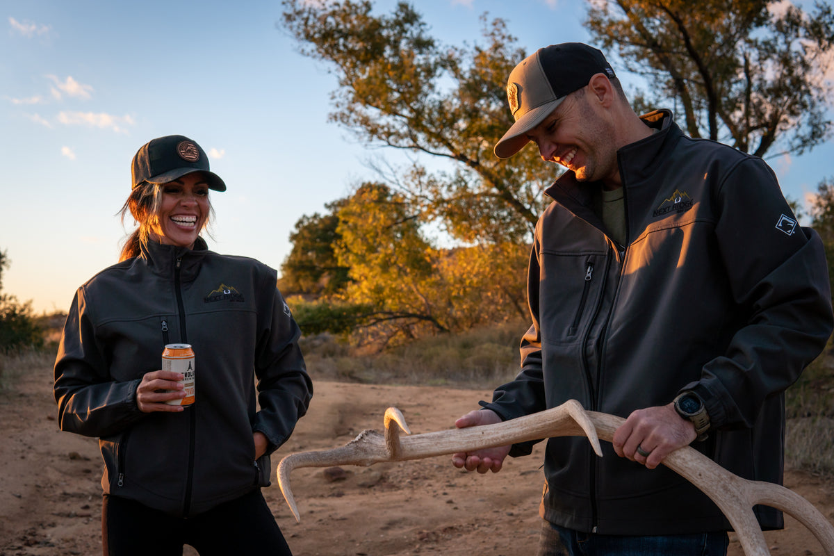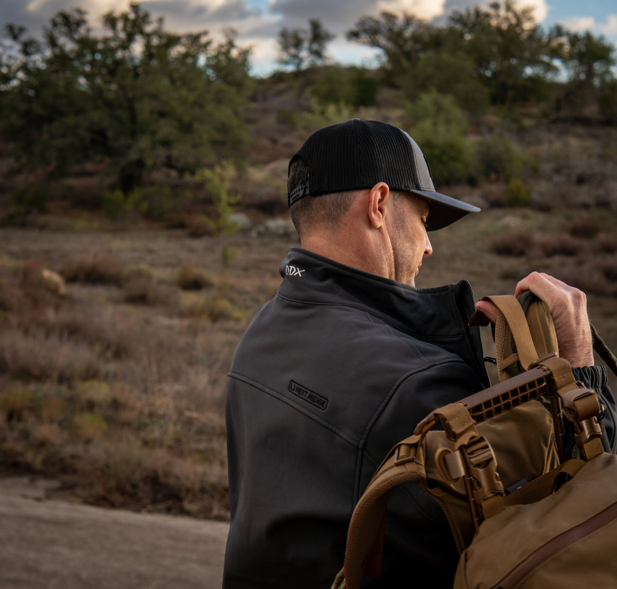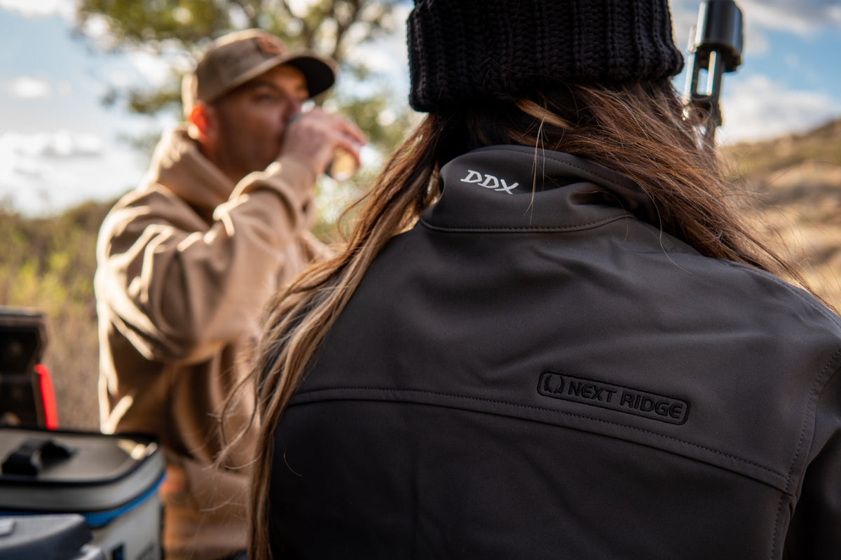 This collared soft shell jacket is the perfect outerwear layer for the cooler days ahead. Charcoal gray with Next Ridge Get There logo embroidered on the front and Next Ridge logo embroidered on the back.